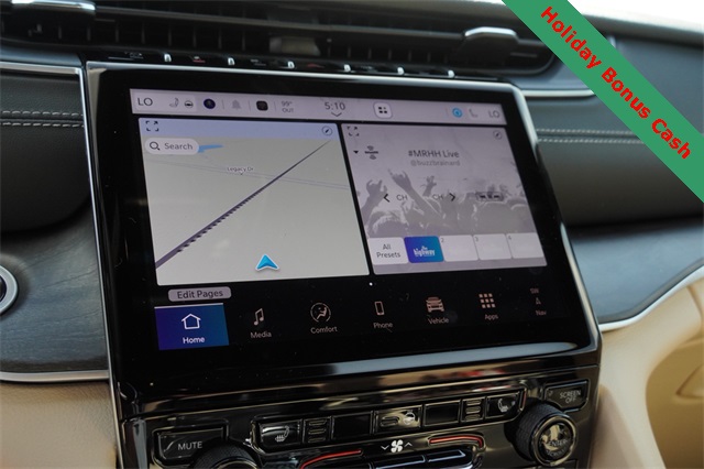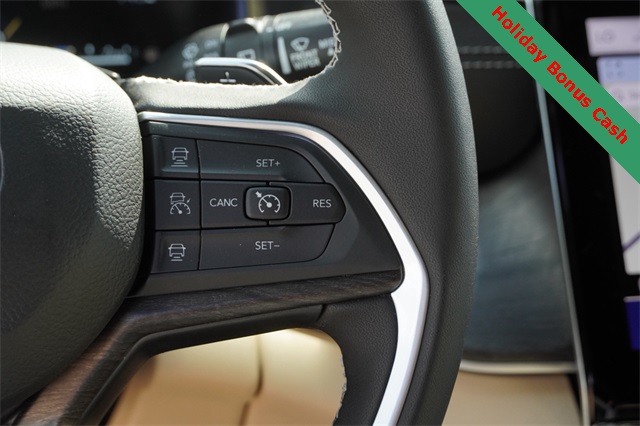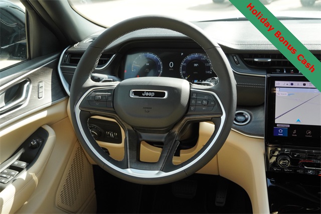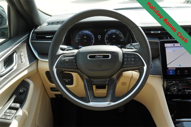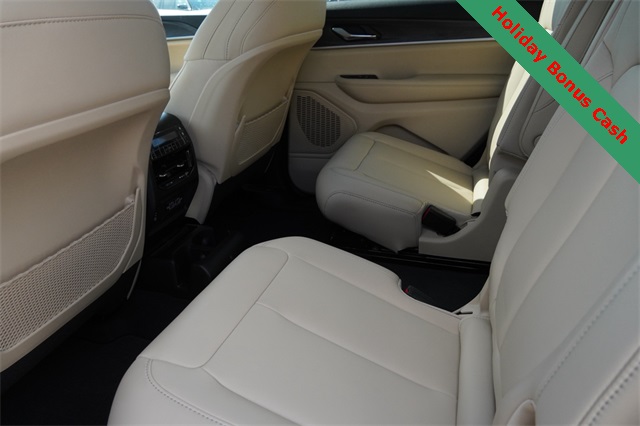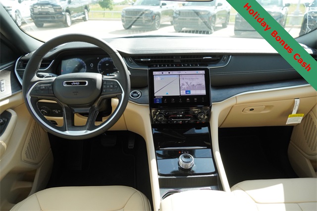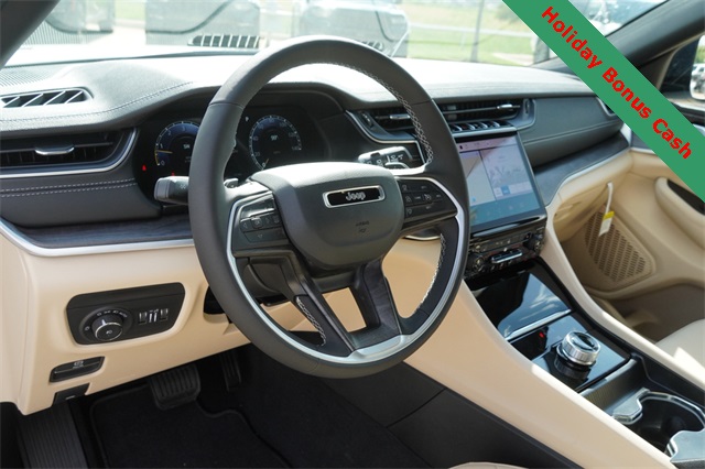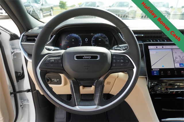 This Grand Cherokee L Limited comes well equipped with Black Appearance Package (Gloss Black Exterior Accents and Wheels: 20" x 8.5" Gloss Black Painted Aluminum), Quick Order Package 22E, Grand Cherokee L Limited, 4D Sport Utility, 3.6L V6 24V VVT, 8-Speed Automatic, RWD, Bright White Clearcoat, Wicker Beige/Black Artificial Leather, Dual-Pane Panoramic Sunroof, Heated front seats, Heated rear seats, Interior Rear Facing Camera, Navigation System, Power Liftgate, 3.45 Rear Axle Ratio, 3rd row seats: split-bench, 4-Wheel Disc Brakes, 6 Speakers, ABS brakes, Active Noise Control System, Air Conditioning, Alloy wheels, AM/FM radio: SiriusXM with 360L, Anti-whiplash front head restraints, Audio memory, Auto High-beam Headlights, Automatic temperature control, Brake assist, Bumpers: body-color, Capri Leatherette Seats, Compass, Delay-off headlights, Driver door bin, Driver vanity mirror, Dual front impact airbags, Dual front side impact airbags, Electronic Stability Control, Emergency communication system, Four wheel independent suspension, Front anti-roll bar, Front Bucket Seats, Front Center Armrest w/Storage, Front dual zone A/C, Front fog lights, Front License Plate Bracket, Front reading lights, Fully automatic headlights, Garage door transmitter, Heated door mirrors, Heated steering wheel, Illuminated entry, Knee airbag, Low tire pressure warning, Manual Fold Seatbacks, Memory seat, Model Year Tracking, Normal Duty Suspension, Occupant sensing airbag, Outside temperature display, Overhead airbag, Overhead console, Panic alarm, ParkView Rear Back-Up Camera, Passenger door bin, Passenger vanity mirror, Power door mirrors, Power driver seat, Power passenger seat, Power steering, Power windows, Radio data system, Radio: Uconnect 5 Nav w/10.1" Display, Rear air conditioning, Rear anti-roll bar, Rear reading lights, Rear window defroster, Rear window wiper, Reclining 3rd row seat, Remote keyless entry, Security system, Speed control, Speed-Sensitive Wipers, Split folding rear seat, Spoiler, Steering wheel mounted audio controls, Tachometer, Telescoping steering wheel, Tilt steering wheel, Traction control, Trip computer, Turn signal indicator mirrors, Variably intermittent wipers, and Voltmeter.