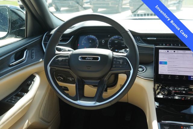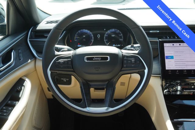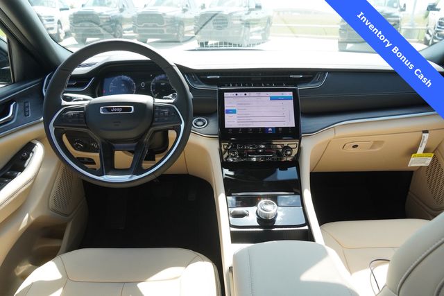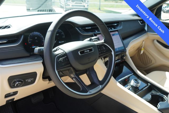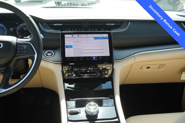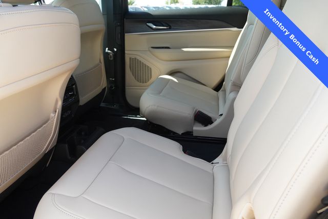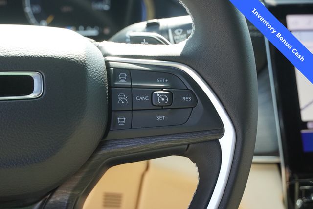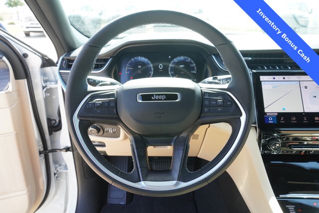 This Grand Cherokee L Limited comes well equipped with Black Appearance Package (Gloss Black Exterior Accents and Wheels: 20" x 8.5" Gloss Black Painted Aluminum), Quick Order Package 22E, 3rd row seats: split-bench, Capri Leatherette Seats, Dual-Pane Panoramic Sunroof, Interior Rear Facing Camera, Navigation System, ParkView Rear Back-Up Camera, Power Liftgate, 3.45 Rear Axle Ratio, 4-Wheel Disc Brakes, 6 Speakers, ABS brakes, Active Noise Control System, Air Conditioning, Alloy wheels, AM/FM radio: SiriusXM with 360L, Anti-whiplash front head restraints, Audio memory, Auto High-beam Headlights, Automatic temperature control, Brake assist, Bumpers: body-color, Compass, Delay-off headlights, Driver door bin, Driver vanity mirror, Dual front impact airbags, Dual front side impact airbags, Electronic Stability Control, Emergency communication system, Four wheel independent suspension, Front anti-roll bar, Front Bucket Seats, Front Center Armrest w/Storage, Front dual zone A/C, Front fog lights, Front License Plate Bracket, Front reading lights, Fully automatic headlights, Garage door transmitter, Heated door mirrors, Heated front seats, Heated rear seats, Heated steering wheel, Illuminated entry, Knee airbag, Low tire pressure warning, Manual Fold Seatbacks, Memory seat, Model Year Tracking, Normal Duty Suspension, Occupant sensing airbag, Outside temperature display, Overhead airbag, Overhead console, Panic alarm, Passenger door bin, Passenger vanity mirror, Power door mirrors, Power driver seat, Power passenger seat, Power steering, Power windows, Radio data system, Rear air conditioning, Rear anti-roll bar, Rear reading lights, Rear window defroster, Rear window wiper, Reclining 3rd row seat, Remote keyless entry, Security system, Speed control, Speed-Sensitive Wipers, Split folding rear seat, Spoiler, Steering wheel mounted audio controls, Tachometer, Telescoping steering wheel, Tilt steering wheel, Traction control, Trip computer, Turn signal indicator mirrors, Variably intermittent wipers, and Voltmeter.
