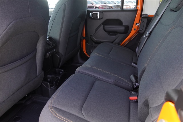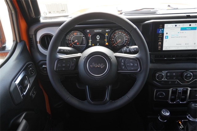 This Wrangler Sport S comes well equipped with Convenience Group (Cluster 7.0" TFT Color Display, Heated Front Seats, Heated Steering Wheel, Remote Start System, Universal Garage Door Opener, 2-Door Passive Entry, Front Door Locks, Air Conditioning w/Auto Temperature Control, Air Filtering, and Emergency/Assistance Call), Quick Order Package 22S Sport S (Automatic Headlamps, Corning Gorilla Glass, Enhanced Adaptive Cruise Control, Power Heated Mirrors, Premium Wrapped Steering Wheel, Wheels: 17" x 7.5" Gray, Advanced Brake Assist, Deep Tint Sunscreen Windows, Full Speed Forward Collision Warning Plus, Security Alarm, and Sun Visors w/Illuminated Vanity Mirrors), ParkView Rear Back-Up Camera, Rear Window Defroster, Rear Window Wiper/Washer, Sky 1-Touch Power Top, 110 MPH Vehicle Max Speed Calibration, 3.45 Overall Top Gear Ratio, 4-Wheel Disc Brakes, 8 Speakers, ABS brakes, Air Conditioning, AM/FM radio: SiriusXM, Apple CarPlay/Android Auto, Aux Battery, Brake assist, Cloth Low-Back Bucket Seats, Compass, Delay-off headlights, Driver door bin, Driver vanity mirror, Dual front impact airbags, Dual front side impact airbags, Electronic Stability Control, Front anti-roll bar, Front Bucket Seats, Front Center Armrest w/Storage, Front fog lights, Front reading lights, Illuminated entry, Integrated roll-over protection, Low tire pressure warning, MOPAR All-Weather Floor Mats, Non-Lock Fuel Cap w/o Discriminator, Normal Duty Suspension, Occupant sensing airbag, Outside temperature display, Overhead airbag, Panic alarm, Passenger door bin, Passenger vanity mirror, Power steering, Power Top Quarter Window Storage Bag, Power windows, Radio data system, Radio: Uconnect 5 w/12.3" Display, Rear anti-roll bar, Rear reading lights, Remote keyless entry, Removable Rear Quarter Windows, Speed control, Split folding rear seat, Steering wheel mounted audio controls, Stop-Start Dual Battery System, Tachometer, Telescoping steering wheel, Tilt steering wheel, Traction control, Trip computer, and Variably intermittent wipers.