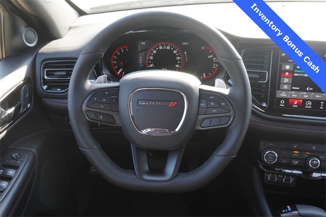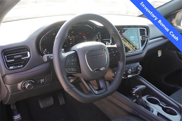This Durango GT comes well equipped with Blacktop Package (Black Roof Rails, Gloss Black Badges, Gloss Black Exterior Mirrors, GT Gloss Black Badging, Integrated Roof Rail Crossbars, Satin Black Dodge Tail Lamp Badge, and Wheels: 20" x 8" Black Noise Aluminum), Quick Order Package 2BD GT, Power Liftgate, 3.27 Rear Axle Ratio, 3rd row seats: split-bench, 4-Wheel Disc Brakes, 6 Speakers, ABS brakes, Air Conditioning, Alloy wheels, AM/FM radio: SiriusXM w/360L, Apple CarPlay/Android Auto, Auto-dimming Rear-View mirror, Auto-leveling suspension, Automatic temperature control, Brake assist, Bumpers: body-color, Compass, Delay-off headlights, Driver door bin, Driver vanity mirror, Dual front impact airbags, Dual front side impact airbags, Electronic Stability Control, Emergency communication system: Dodge Connect, Four wheel independent suspension, Front anti-roll bar, Front Bucket Seats, Front Center Armrest w/Storage, Front dual zone A/C, Front License Plate Bracket, Front reading lights, Fully automatic headlights, Garage door transmitter, Heated door mirrors, Heated front seats, Heated steering wheel, Illuminated entry, Knee airbag, Leather steering wheel, Low tire pressure warning, Occupant sensing airbag, Outside temperature display, Overhead airbag, Overhead console, Panic alarm, ParkView Rear Back-Up Camera, Passenger door bin, Passenger vanity mirror, Power door mirrors, Power driver seat, Power steering, Power windows, Radio data system, Rear air conditioning, Rear anti-roll bar, Rear Load Leveling Suspension, Rear reading lights, Rear seat center armrest, Rear window defroster, Rear window wiper, Remote keyless entry, Speed control, Speed-sensing steering, Speed-Sensitive Wipers, Split folding rear seat, Spoiler, Sport steering wheel, Steering wheel mounted audio controls, Tachometer, Telescoping steering wheel, Tilt steering wheel, Traction control, Trip computer, Variably intermittent wipers, and Voltmeter.