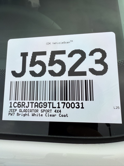 Bright White Clearcoat 2026 Jeep Gladiator Sport S 4D Crew Cab Sport S 8-Speed Automatic 3.6L V6 24V VVT 4WD PRICE REDUCED TO SELL BY MONTH END, 110 Mph Vehicle Max Speed Calibration, 12.3" Touchscreen Display, 4-Wheel Disc Brakes, 4.10 Rear Axle Ratio, 4G LTE Wi-Fi Hot Spot, 8 Speakers, ABS brakes, Advanced Brake Assist, Air Conditioning, Alexa Built-in, AM/FM radio: SiriusXM with 360L, Anti-Spin Differential Rear Axle, Apple CarPlay, Apple CarPlay/Android Auto, Automatic Headlamps, Auxiliary Switches, Black Molded-in-Color Fender Flares (2-Piece), Brake assist, Class IV Receiver Hitch, Compass, Connectivity - US/Canada, Conventional Differential Front Axle, Dana M210 Wide Front Axle, Dana M220 Wide Rear Axle, Daytime Running Lamp System, Deep Tint Sunscreen Windows, Delay-off headlights, Driver door bin, Driver vanity mirror, Dual front impact airbags, Dual front side impact airbags, Electronic Stability Control, Front anti-roll bar, Front Bucket Seats, Front Center Armrest w/Storage, Front fog lights, Front reading lights, Full Speed Forward Collision Warning Plus, Google Android Auto, Heavy-Duty Engine Cooling, Illuminated entry, Integrated roll-over protection, Low tire pressure warning, Max Tow Package with 4.10 Axle Ratio, Normal Duty Plus Suspension, Normal Duty Suspension, Occupant sensing airbag, Outside temperature display, Overhead airbag, Panic alarm, ParkView Rear Back-Up Camera, Passenger door bin, Passenger vanity mirror, Power Heated Mirrors, Power steering, Power windows, Premium Wrapped Steering Wheel, Quick Order Package 24S Sport S, Radio data system, Radio: Uconnect 5 with 12.3" Display, Rear anti-roll bar, Rear reading lights, Remote keyless entry, Security Alarm, Speed control, Split folding rear seat, Steering wheel mounted audio controls, Sun Visors with Illuminated Vanity Mirrors, Tachometer, Telescoping steering wheel, Tilt steering wheel, Traction control, Trailer Hitch Zoom, Trailer Tow and Auxiliary Switch Group, Trip computer, USB Host Flip, Variably intermittent wipers, Voltmeter, Wheels: 17" x 7.5" Gray.