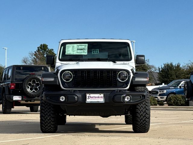 2026 Jeep Wrangler Willys 4D Sport Utility bright white clearcoat 4WD 8-Speed Automatic 3.6L V6 24V VVT This vehicle comes well equipped with Convenience Group (2-Door Passive Entry, Front Door Locks, Air Conditioning with Auto Temp Control, Air Filtering, Cluster 7.0" TFT Color Display, Emergency/Assistance Call, Heated Front Seats, Heated Steering Wheel, and Universal Garage Door Opener), Dual Top Group (Premium Black Sunrider Soft Top with Dual Top Group), Quick Order Package 24W Willys (4-Wheel Drive Swing Gate Decal, 4.10 Rear Axle Ratio, 7 and 4 Pin Wiring Harness, Advanced Brake Assist, Automatic Headlamps, Auxiliary Switches, Black Grille with Gloss Black Rings, Class II Receiver Hitch, Conventional Differential Front Axle, Corning Gorilla Glass, Dana M210 Wide HD Tube Front Axle, Dana M220 Wide Rear Axle, Daytime Running Lamps LED Accents, Deep Tint Sunscreen Windows, E-Locker Rear Axle, Enhanced Adaptive Cruise Control, Front LED Fog Lamps, Full Speed Forward Collision Warning Plus, Injection Molded Black Rear Bumper, LED Premium Reflector Headlamps, Mold in Color Bumper with Gloss Black, Molded in Color Rubicon Highline Flare, MOPAR All-Weather Floor Mats, Off-Road Plus Mode, Power Heated Mirrors, Premium Wrapped Steering Wheel, Security Alarm, Sun Visors with Illuminated Vanity Mirrors, Wheels: 17" x 7.5" Painted Black, Willy's Suspension, and Willys Hood Decal), Steel Power Dome Hood Package (Power Dome Dual Vented Hood), Trailer Tow and Auxiliary Switch Group, Wrangler Willys, 4D Sport Utility, 3.6L V6 24V VVT, 4WD, bright white clearcoat, and Black Cloth Convenience Group (2-Door Passive Entry, Front Door Locks, Air Conditioning with Auto Temp Control, Air Filtering, Cluster 7.0" TFT Color Display, Emergency/Assistance Call, Heated Front Seats, Heated Steering Wheel, and Universal Garage Door Opener), Dual Top Group (Premium Black Sunrider Soft Top with Dual Top Group), Quick Order Package 24W Willys (4-Wheel Drive Swing Gate Decal, 4.10 Rear Axle Ratio, 7 and 4 Pin Wiring Harness, Advanced Brake Assist, Automatic Headlamps, Auxiliary Switches, Black Grille with Gloss Black Rings, Class II Receiver Hitch, Conventional Differential Front Axle, Corning Gorilla Glass, Dana M210 Wide HD Tube Front Axle, Dana M220 Wide Rear Axle, Daytime Running Lamps LED Accents, Deep Tint Sunscreen Windows, E-Locker Rear Axle, Enhanced Adaptive Cruise Control, Front LED Fog Lamps, Full Speed Forward Collision Warning Plus, Injection Molded Black Rear Bumper, LED Premium Reflector Headlamps, Mold in Color Bumper with Gloss Black, Molded in Color Rubicon Highline Flare, MOPAR All-Weather Floor Mats, Off-Road Plus Mode, Power Heated Mirrors, Premium Wrapped Steering Wheel, Security Alarm, Sun Visors with Illuminated Vanity Mirrors, Wheels: 17" x 7.5" Painted Black, Willy's Suspension, and Willys Hood Decal), Steel Power Dome Hood Package (Power Dome Dual Vented Hood), Trailer Tow and Auxiliary Switch Group, Wrangler Willys, 4D Sport Utility, 3.6L V6 24V VVT, 4WD, bright white clearcoat, Black Cloth, 12.3" Touchscreen Display, 4-Wheel Disc Brakes, 4G LTE Wi-Fi Hot Spot, 8 Speakers, ABS brakes, Air Conditioning, AM/FM radio: SiriusXM with 360L, Apple CarPlay, Apple CarPlay/Android Auto, Aux Battery, Black 3-Piece Hard Top, Brake assist, Compass, Connectivity - US/Canada, Delay-off headlights, Driver door bin, Driver vanity mirror, Dual front impact airbags, Dual front side impact airbags, Electronic Stability Control, For More Info, Call 800-643-2112, Freedom Panel Storage Bag, Front anti-roll bar, Front Bucket Seats, Front Center Armrest w/Storage, Front fog lights, Front reading lights, Google Android Auto, Illuminated entry, Integrated Center Stack Radio, Integrated roll-over protection, Low tire pressure warning, No Soft Top, Non-Lock Fuel Cap Without Discriminator, Normal Duty Suspension, Occupant sensing airbag, Outside temperature display, Overhead airbag, Price includes: $1500 - 2026 Southwest BC Bonus Cash . Exp. 03/31/2026