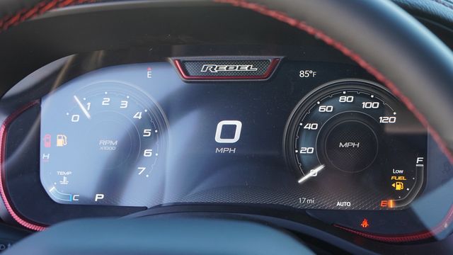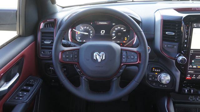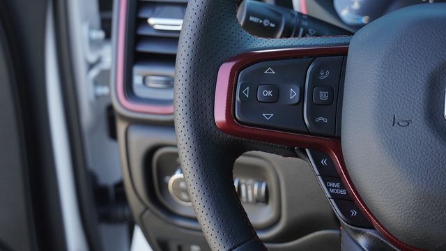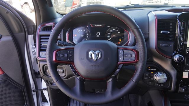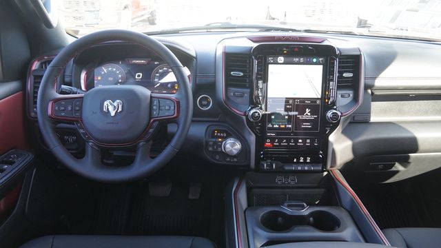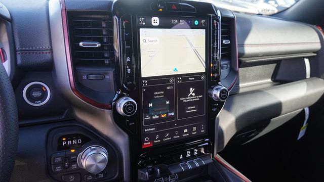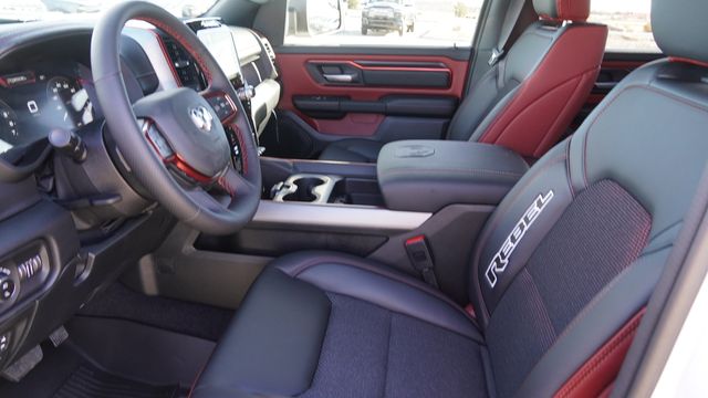 This 1500 Rebel comes well equipped with Bed Utility Group (Exterior 115V AC Outlet, MOPAR 4 Adjustable Cargo Tie-Down Hooks, and MOPAR Spray in Bedliner), Quick Order Package 21W Rebel, Rebel Level 1 Equipment Group (Auto Power-Folding Mirrors, Auto-Dimming Exterior Driver Mirror, Black Exterior Mirrors, Black Premium Power Mirrors, Convex Wide-Angle Exterior Mirror Insert, Exterior Mirrors Courtesy Lamps, Exterior Mirrors with Heating Element, Exterior Mirrors with Supplemental Signals, Power Adjustable Pedals, Rear Window Defroster, Remote Tailgate Release, and Wireless Charging Pad), 10 Speakers, 3.92 Rear Axle Ratio, 33 Gallon Fuel Tank, 4 Way Front Headrests, 4-Wheel Disc Brakes, 4G LTE Wi-Fi Hot Spot, ABS brakes, Active Noise Control System, Air Conditioning, Alloy wheels, AM/FM radio: SiriusXM with 360L, Apple CarPlay, Apple CarPlay/Android Auto, Auto High-beam Headlights, Auto-dimming Rear-View mirror, Automatic temperature control, Brake assist, Bucket Seats, Cloth/Vinyl Bucket Seats, Compass, Connected Travel and Traffic Services, Connectivity - US/Canada, Delay-off headlights, Disassociated Touchscreen Display, Driver door bin, Driver vanity mirror, Dual front impact airbags, Dual front side impact airbags, Electronic Stability Control, Front anti-roll bar, Front Bucket Seats, Front Center Armrest w/Storage, Front dual zone A/C, Front fog lights, Front License Plate Bracket, Front reading lights, Front Seat Back Map Pockets, Front wheel independent suspension, Full Length Upgraded Floor Console, Fully automatic headlights, Garage door transmitter, Global Telematics Box Module, Google Android Auto, GPS Antenna Input, GPS Navigation, HD Radio, Heated door mirrors, Heated Front Seats, Heated front seats, Heated Steering Wheel, Heated steering wheel, Illuminated entry, Integrated Center Stack Radio, Integrated Voice Command with Bluetooth, Leather steering wheel, Low tire pressure warning, Manual Folding Exterior Mirrors, Navigation System, Occupant sensing airbag, Off-Road Information Pages, Outside temperature display, Overhead airbag, Overhead console, Panic alarm, ParkView Rear Back-Up Camera, Passenger door bin, Passenger vanity mirror, Power 2-Way Driver Lumbar Adjust, Power Adjust 8-Way Driver Seat, Power door mirrors, Power driver seat, Power steering, Power windows, Radio data system, Radio: Uconnect 5 Navigation with 12.0" Display, Rear 60/40 Folding Seat, Rear anti-roll bar, Rear seat center armrest, Rear step bumper, Remote keyless entry, SiriusXM Radio Service, SiriusXM with 360L, Speed control, Split folding rear seat, Steering wheel mounted audio controls, Tachometer, Telescoping steering wheel, Tilt steering wheel, Traction control, Trailer Brake Control, Trip computer, USB Host Flip, Variably intermittent wipers, Voltmeter, and Wheels: 18" x 8.0" Painted Mid-Gloss Black.
