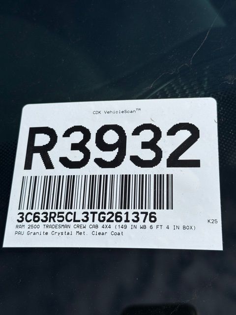 Granite Crystal Metallic Clearcoat 2026 Ram 2500 Tradesman 4D Crew Cab Tradesman 8-Speed Automatic 6.7L I6 4WD PRICE REDUCED TO SELL BY MONTH END, 2500 Tradesman, 4D Crew Cab, 6.7L I6, 8-Speed Automatic, 4WD, Granite Crystal Metallic Clearcoat, Black Cloth, 115-Volt Auxiliary Front Power Outlet, 12" Touchscreen Display, 2 Way Rear Headrest Seat, 4 Way Front Headrests, 4-Wheel Disc Brakes, 40/20/40 Split Bench Seat, 400W Inverter, 4G LTE Wi-Fi Hot Spot, 6 Speakers, ABS brakes, Air Conditioning, Air Conditioning ATC with Dual Zone Control, Alexa Built-in, AM/FM radio: SiriusXM, Anti-Spin Differential Rear Axle, Apple CarPlay, Apple CarPlay/Android Auto, Auto Power-Folding Mirrors, Auto-Dimming Rear-View Mirror, Black Exterior Mirrors, Black Wheel Center Hub, Blind Spot and Cross Path Detection, Brake assist, Bright Front Bumper, Bright Rear Bumper, Carpet Floor Covering, Center Hub, Center Stop Lamp with Cargo View Camera, Chrome Grille Surround, Clearance Lamps, Cloth 40/20/40 Bench Seat, Compass, Connected Travel and Traffic Services, Connectivity - US/Canada, Dash Pass Thru Wire Circuits, Delay-off headlights, Disassociated Touchscreen Display, Driver door bin, Dual Alternators Rated At 480 Amps, Dual front impact airbags, Dual front side impact airbags, Electronic Stability Control, Emergency Vehicle Alert System (EVAS), Exterior 115V AC Outlet, Exterior Mirrors Courtesy Lamps, Exterior Mirrors with Heating Element, Exterior Mirrors with Supplemental Signals, For Details, Visit DriveUconnect.com, For More Info, Call 800-643-2112, Forward and Reverse Utility Lights, Front and Rear Floor Mats, Front anti-roll bar, Front Armrest with Cupholders, Front Center Armrest w/Storage, Front fog lights, Front reading lights, Fully automatic headlights, Global Telematics Box Module, Google Android Auto, GPS Antenna Input, GPS Navigation, HD Radio, Illuminated entry, Instrument Panel Mounted Auxiliary Switches, Integrated Voice Command with Bluetooth, LED Tail Lamps, Low tire pressure warning, Manual Adjust 4-Way Driver Seat, Manual Adjust 4-Way Front Passenger Seat, Manual Folding Exterior Mirrors, Matte Black Mesh Grille with Chrome, Mirror Running Lights, Mopar Black Tubular Side Steps, MOPAR Trailer Camera Wiring with No Camera, Occupant sensing airbag, Off-Road Info Pages, on Board Power System - 2.4KW, Outside temperature display, Overhead airbag, Overhead console, Panic alarm, ParkSense Front/Rear Park Assist System, ParkView Rear Back-Up Camera, Passenger door bin, Passenger vanity mirror, Power Adjust Mirrors, Power Heated Folding Telescope Mirrors, Power Heated Folding Telescopic Mirrors, Power steering, Power Telescoping Mirrors, Power windows, Power-Adjustable Convex Aux Mirrors, Quick Order Package 24A Tradesman, Radio data system, Radio: Uconnect 5 Navigation with 12.0" Display, Radio: Uconnect 5 with 8.4" Display, Rear anti-roll bar, Rear Folding Seat, Rear Power Sliding Window, Rear step bumper, Rear Wheelhouse Liners, Rear window defroster, Red Tail Lamp Bezels, Remote keyless entry, Remote USB Port - Charge Only, Selectable Tire Fill Alert, SiriusXM Radio Service, SiriusXM with 360L, Speed control, Storage Tray, Surround View Camera System, Tachometer, Tilt steering wheel, Tinted Acoustic Windshield Glass, Towing Technology Group, Traction control, Tradesman Level 2 Equipment Group, Trailer Reverse Guidance, Trailer Tire Pressure Monitoring System, Trailer Tow Pages, Voltmeter, Wheels: 18" x 8.0" Steel Chrome Clad.