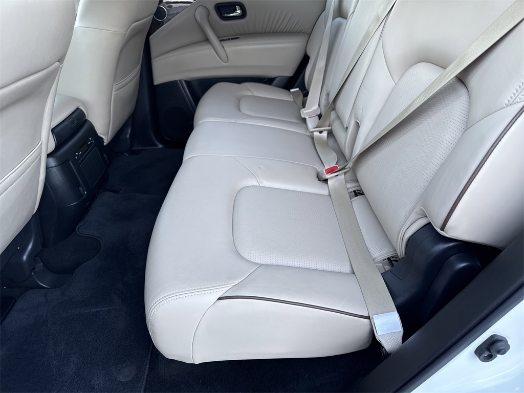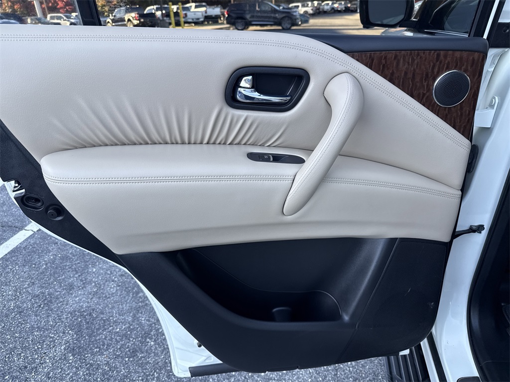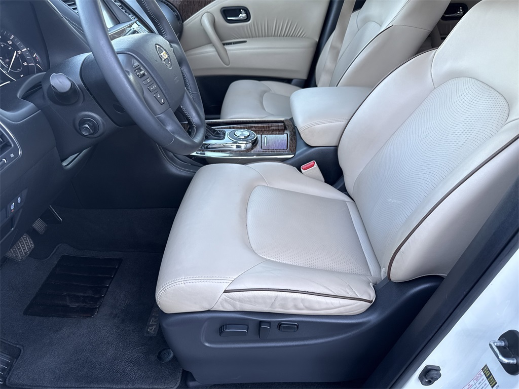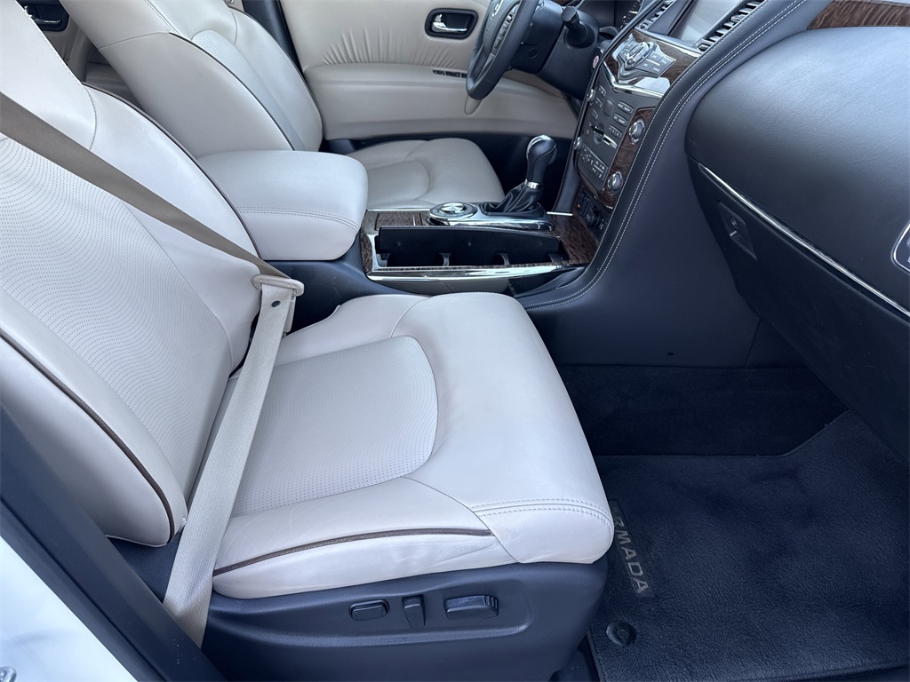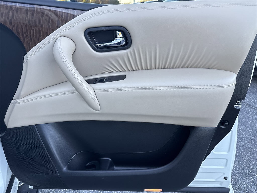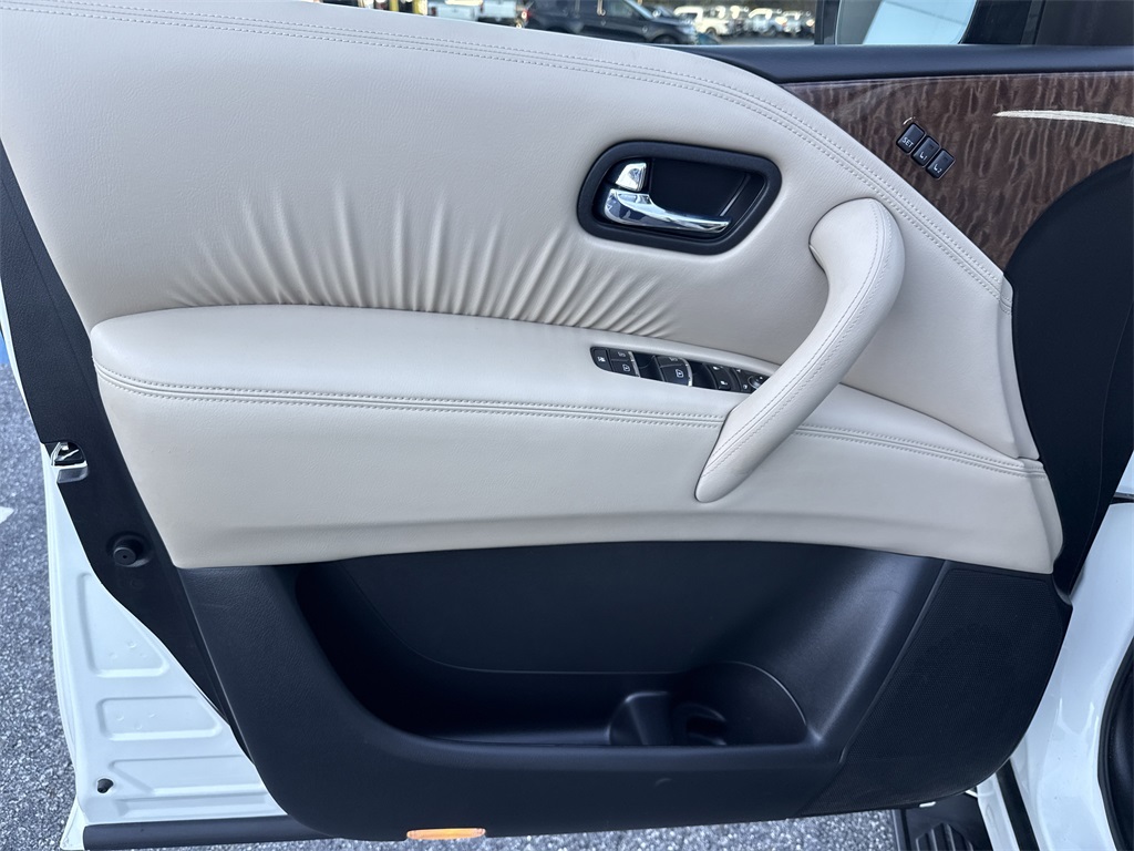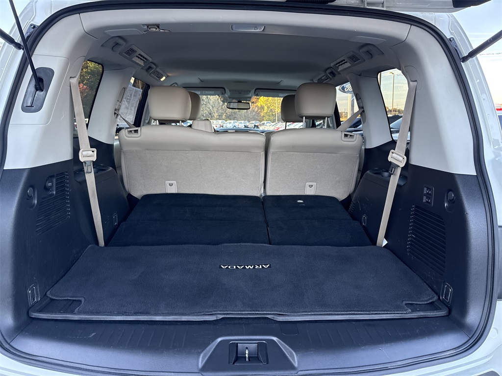**Local Trade In**, **One Owner**, **Low Mileage**, **Power Sunroof/Moonroof**, **Leather interior**, **Heated/Cooled Seats**, **Front bucket seats with center console**, **Bluetooth/Hands Free**, **Rear back up camera**, **Reverse Sensing System**, **Blind Spot Detection**, **Lane monitor**, **Drivers Power Seat**, **Passenger power seat**, **Power liftgate**, **Remote start**, **Fixed running boards/side steps**, and **SIRIUS SAT. RADIO** Cargo Package, Premium Package (Blind Spot Warning, Intelligent Back-Up Intervention (I-BI), Intelligent Distance Control (I-DC), Power Sliding Moonroof w/Front Tilt & Rear Slide, and Rear Cross Traffic Alert (RCTA)), 13 Speakers, 2.937 Axle Ratio, 2nd & 3rd Row Carpeted Mats, 3rd row seats: split-bench, 4-Wheel Disc Brakes, ABS brakes, Air Conditioning, Alloy wheels, AM/FM radio: SiriusXM, Anti-whiplash front head restraints, Auto tilt-away steering wheel, Auto-dimming door mirrors, Auto-dimming Rear-View mirror, Auto-leveling suspension, Automatic temperature control, Brake assist, Bumpers: body-color, CD player, Cross Bars, Delay-off headlights, Driver door bin, Driver vanity mirror, Dual front impact airbags, Dual front side impact airbags, Electronic Stability Control, Emergency communication system: NissanConnect Services, Four wheel independent suspension, Front anti-roll bar, Front Bucket Seats, Front Center Armrest, Front dual zone A/C, Front fog lights, Front reading lights, Fully automatic headlights, Garage door transmitter: HomeLink, Heated door mirrors, Heated Front Bucket Seats w/Driver Memory, Heated front seats, Illuminated entry, Illuminated Kick Plates, Leather Shift Knob, Leather-Appointed Seat Trim, Low tire pressure warning, Memory seat, Navigation System, Occupant sensing airbag, Outside temperature display, Overhead airbag, Overhead console, Panic alarm, Passenger door bin, Passenger vanity mirror, Power door mirrors, Power driver seat, Power Liftgate, Power passenger seat, Power steering, Power windows, Radio data system, Radio: AM/FM/SXM/CD/MP3/HD, Rain sensing wipers, Rear air conditioning, Rear anti-roll bar, Rear reading lights, Rear seat center armrest, Rear window defroster, Rear window wiper, Reclining 3rd row seat, Remote keyless entry, Roof rack: rails only, Security system, Special Paint - Pearl White, Speed control, Speed-sensing steering, Speed-Sensitive Wipers, Split folding rear seat, Spoiler, Steering wheel memory, Steering wheel mounted audio controls, Tachometer, Telescoping steering wheel, Tilt steering wheel, Traction control, Trip computer, Turn signal indicator mirrors, Variably intermittent wipers, Voltmeter, and Wheels: 20" Machined Finish Painted Alloy Shottenkirk Ford of Jasper is pleased to offer you this exceptional 2019 Nissan Armada. This SL Armada Exterior is finished in Pearl White Tricoat and the interior is finished in Almond Leather. CARFAX One-Owner.