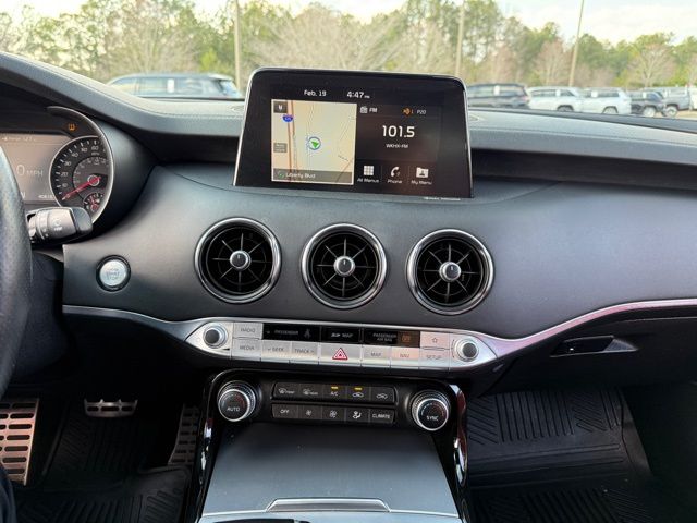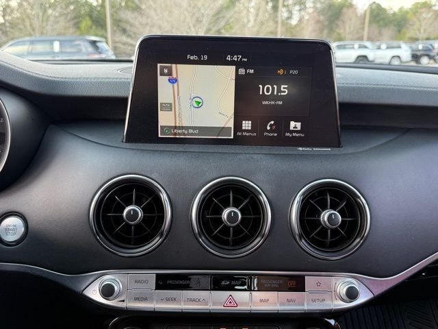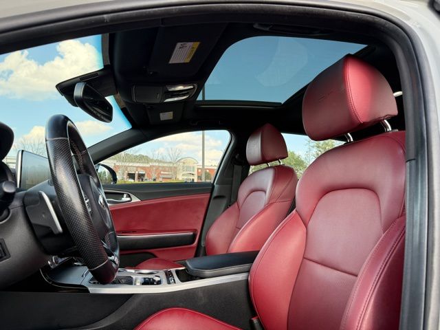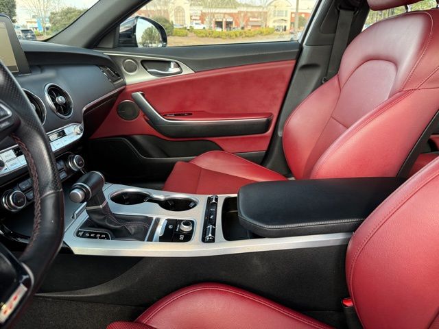 This vehicle comes well equipped with Stinger GT1, 4D Sedan, V6, 8-Speed Automatic, RWD, Ceramic Silver, and Black Leather Red Interior Color Package (Red Leather Seat Trim), Stinger GT1, 4D Sedan, V6, 8-Speed Automatic, RWD, Ceramic Silver, Black Leather, 15 Speakers, 4-Wheel Disc Brakes, ABS brakes, Adaptive suspension, Air Conditioning, Alloy wheels, AM/FM radio: SiriusXM, Anti-whiplash front head restraints, Apple CarPlay & Android Auto, Auto High-beam Headlights, Auto tilt-away steering wheel, Auto-dimming door mirrors, Auto-dimming Rear-View mirror, Automatic temperature control, Brake assist, Bumpers: body-color, Carpeted Floor Mat, Compass, Delay-off headlights, Driver door bin, Driver vanity mirror, Dual front impact airbags, Dual front side impact airbags, Electronic Stability Control, Emergency communication system: UVO eServices, Exterior Parking Camera Rear, Four wheel independent suspension, Front anti-roll bar, Front Bucket Seats, Front Center Armrest, Front dual zone A/C, Front reading lights, Fully automatic headlights, Garage door transmitter: HomeLink, Heated & Ventilated Front Bucket Seats, Heated door mirrors, Heated front seats, Illuminated entry, Knee airbag, Leather Seat Trim, Low tire pressure warning, Memory seat, Navigation System, Occupant sensing airbag, Outside temperature display, Overhead airbag, Overhead console, Panic alarm, Passenger door bin, Passenger vanity mirror, Power door mirrors, Power driver seat, Power moonroof, Power passenger seat, Power steering, Power windows, Radio: AM/FM/MP3/HD/SiriusXM harman/kardon Audio, Rain sensing wipers, Rear air conditioning, Rear anti-roll bar, Rear Bumper Applique, Rear reading lights, Rear seat center armrest, Rear window defroster, Remote keyless entry, Security system, Speed control, Speed-sensing steering, Speed-Sensitive Wipers, Split folding rear seat, Sport steering wheel, Steering wheel memory, Steering wheel mounted audio controls, Tachometer, Telescoping steering wheel, Tilt steering wheel, Traction control, Trip computer, Turn signal indicator mirrors, Variably intermittent wipers, Ventilated front seats, and Wheels: 19" x 8.0 Front & 19" x 8.5 Rear Alloy.