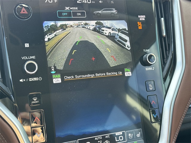 This vehicle comes well equipped with Standard Model, 12 Speakers, 4-Wheel Disc Brakes, ABS brakes, Air Conditioning, AM/FM radio: SiriusXM, Auto High-beam Headlights, Auto-dimming Rear-View mirror, Automatic temperature control, Brake assist, Bumpers: body-color, Cargo Sidewall Protector, Compass, Crystal Black Silica Body Side Molding, Crystal Black Silica Door Edge Guards, Driver door bin, Driver vanity mirror, Dual front impact airbags, Dual front side impact airbags, Electronic Stability Control, Emergency communication system: STARLINK Safety and Security (Subscription Required), Exterior Parking Camera Rear, Four wheel independent suspension, Front anti-roll bar, Front Bucket Seats, Front Center Armrest w/Storage, Front dual zone A/C, Front fog lights, Front reading lights, Fully automatic headlights, Garage door transmitter: HomeLink, harman/kardon® Speakers, Heated & Ventilated Front Bucket Seats, Heated door mirrors, Heated front seats, Heated rear seats, Heated steering wheel, HVAC memory, Illuminated entry, Knee airbag, Leather steering wheel, Low tire pressure warning, Memory seat, Navigation System, Occupant sensing airbag, Outside temperature display, Overhead airbag, Overhead console, Panic alarm, Passenger door bin, Passenger vanity mirror, Perforated Nappa Leather-Trimmed Upholstery, Power door mirrors, Power driver seat, Power Liftgate, Power moonroof, Power passenger seat, Power steering, Power windows, Radio: Subaru STARLINK 11.6" Multimedia Nav System, Rear anti-roll bar, Rear Bumper Cover, Rear Seat Back Protector, Rear seat center armrest, Rear window defroster, Remote CD player, Remote keyless entry, Roof rack, Security system, Speed control, Speed-sensing steering, Split folding rear seat, Spoiler, STARLINK/Apple CarPlay/Android Auto, Steering wheel mounted au