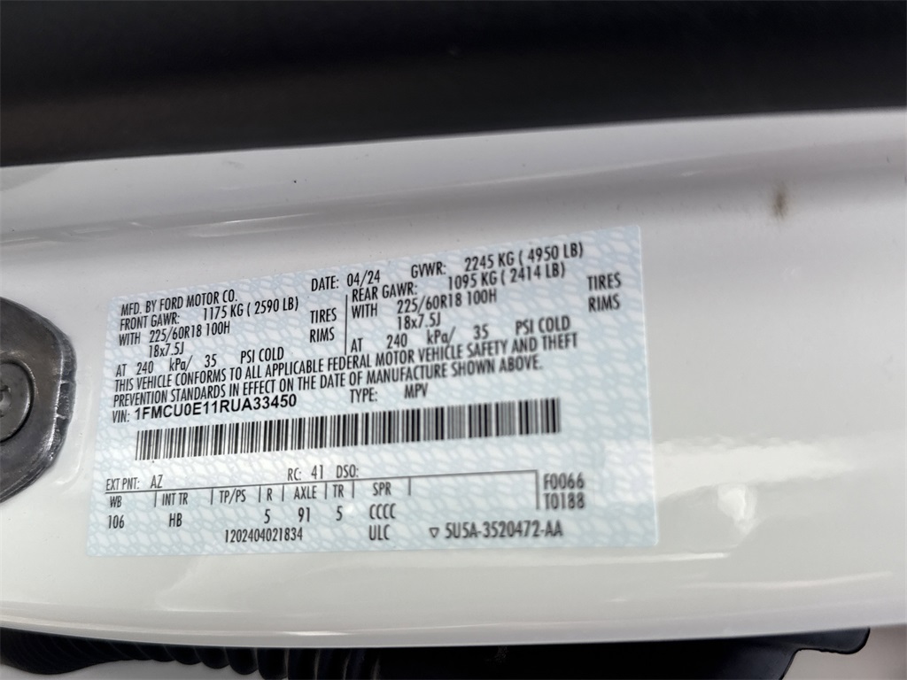 **One Owner**, **Clean Carfax**, **Heated Seats, **Front bucket seats with center console**, Apple car play/ Android auto, **Ford Sync Bluetooth**, **Bluetooth/Hands Free**, **Rear back up camera**, **Reverse Sensing System**, **Blind Spot Detection**, **Lane monitor**, **GPS/ Navigation**, **Drivers Power Seat**, **New tires**, **Power liftgate**, **Remote start**, **SIRIUS SAT. RADIO**, **Spotless inside and out**, **Upgraded wheels**, Forward collison/adaptive cruise control, and B&O sound system Equipment Group 700A, 2.91 Axle Ratio, 4-Wheel Disc Brakes, 6 Speakers, ABS brakes, Air Conditioning, Alloy wheels, AM/FM radio: SiriusXM, AM/FM Stereo, Auto High-beam Headlights, Automatic temperature control, Brake assist, Bumpers: body-color, Compass, Delay-off headlights, Driver door bin, Driver vanity mirror, Dual front impact airbags, Dual front side impact airbags, Electronic Stability Control, Emergency communication system: SYNC 4 911 Assist, Exterior Parking Camera Rear, FordPass Connect, Four wheel independent suspension, Front anti-roll bar, Front Bucket Seats, Front Center Armrest, Front dual zone A/C, Front fog lights, Front License Plate Bracket, Front reading lights, Fully automatic headlights, Heated door mirrors, Heated front seats, Heated steering wheel, Heated Vinyl/Cloth Front Sport Contour Bucket Seats, Illuminated entry, Knee airbag, Low tire pressure warning, Navigation system: Connected Navigation, Occupant sensing airbag, Outside temperature display, Overhead airbag, Overhead console, Panic alarm, Passenger door bin, Passenger vanity mirror, Power door mirrors, Power driver seat, Power Liftgate, Power steering, Power windows, Radio data system, Rear anti-roll bar, Rear reading lights, Rear seat center armrest, Rear window defroster, Rear window wiper, Remote keyless entry, Roof rack: rails only, Speed control, Speed-sensing steering, Speed-Sensitive Wipers, Split folding rear seat, Spoiler, Steering wheel mounted audio controls, SYNC 4 w/Enhanced Voice Recognition, Telescoping steering wheel, Tilt steering wheel, Traction control, Trip computer, Variably intermittent wipers, and Wheels: 19" Machined-Face Magnetic Aluminum Shottenkirk Ford of Jasper is pleased to offer you this exceptional 2024 Ford Escape Plug-In Hybrid. This Escape Plug-In Hybrid Exterior is finished in Star White Metallic Tri-Coat and the interior is finished in Ebony w/Heated Vinyl/Cloth Front Sport Contour Bucket Seats. CARFAX One-Owner. Clean CARFAX. 40/40 City/Highway MPG