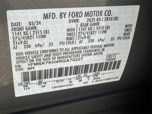 This vehicle comes well equipped with Class IV Trailer Tow Package, Equipment Group 250A, 12 Speakers, 360-Degree Camera Credit, 3rd row seats: bench, 4-Wheel Disc Brakes, 4G LTE Wi-Fi Hotspot Credit, ABS brakes, Air Conditioning, AM/FM radio: SiriusXM, Auto High-beam Headlights, Auto-dimming Rear-View mirror, Automatic temperature control, Brake assist, Bumpers: body-color, Compass, Delay-off headlights, Driver door bin, Driver vanity mirror, Dual front impact airbags, Dual front side impact airbags, Electronic Stability Control, Emergency communication system: SYNC 3 911 Assist, Exterior Parking Camera Rear, FordPass Connect, Four wheel independent suspension, Front & Second Row Floor Liners (16B), Front anti-roll bar, Front Bucket Seats, Front Center Armrest, Front dual zone A/C, Front fog lights, Front reading lights, Fully automatic headlights, Heated door mirrors, Heated front seats, Heated steering wheel, Htd ActiveX Trimmed Captain's Chairs w/Miko Insert, Illuminated entry, Knee airbag, Leather steering wheel, Low tire pressure warning, Navigation System, Occupant sensing airbag, Outside temperature display, Overhead airbag, Overhead console, Panic alarm, Passenger vanity mirror, Power door mirrors, Power driver seat, Power Liftgate, Power passenger seat, Power steering, Power windows, Radio data system, Radio: B&O Sound System by Bang & Olufsen, Rain sensing wipers, Rear air conditioning, Rear anti-roll bar, Rear reading lights, Rear window defroster, Rear window wiper, Remote keyless entry, Security system, Speed control, Speed-sensing steering, Speed-Sensitive Wipers, Split folding rear seat, Spoiler, Steering wheel mounted audio controls, SYNC 3 Communications & Entertainment System, SYNC 3/Apple CarPlay/Android Auto, Tachometer, Telescoping steering wheel, Tilt steering wheel, Traction contr