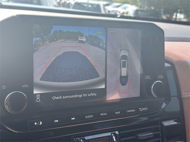 This vehicle comes well equipped with Black Appearance Package (Black Grille (K10) and Black Liftgate Emblems), 13 Speakers, 3rd row seats: bench, 4-Wheel Disc Brakes, ABS brakes, Air Conditioning, AM/FM radio: SiriusXM, Auto High-beam Headlights, Auto tilt-away steering wheel, Auto-dimming Rear-View mirror, Automatic temperature control, Bench Seat Carpeted Floor Mats (Set of 4), Black Splash Guards (Set of 4), Bodyside moldings, Bose Premium Audio System, Brake assist, Bumpers: body-color, Cross Bars, Delay-off headlights, Driver door bin, Driver vanity mirror, Dual front impact airbags, Dual front side impact airbags, Electronic Stability Control, Emergency communication system, Exterior Parking Camera Rear, Four wheel independent suspension, Front anti-roll bar, Front Bucket Seats, Front Center Armrest, Front dual zone A/C, Front reading lights, Fully automatic headlights, Garage door transmitter: HomeLink, Heads-Up Display, Heated & Cooled Front Bucket Seats, Heated door mirrors, Heated front seats, Heated rear seats, Heated steering wheel, Illuminated entry, Knee airbag, Leather steering wheel, Low tire pressure warning, Memory seat, Navigation system: NissanConnect with Navigation and Services, NissanConnect featuring Apple CarPlay and Android Auto, NissanConnect w/Navigation & Services, Occupant sensing airbag, Outside temperature display, Overhead airbag, Overhead console, Panic alarm, Passenger door bin, Passenger vanity mirror, Power door mirrors, Power driver seat, Power Liftgate, Power