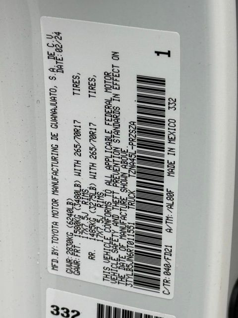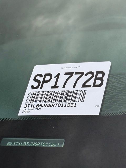 This vehicle comes well equipped with TRD Off Road Package, 4D Double Cab, 2.4L 4-Cylinder, 8-Speed Automatic, 4WD, White, ABS brakes, Alloy wheels, Electronic Stability Control, Heated door mirrors, Illuminated entry, Low tire pressure warning, Remote keyless entry, and Traction control TRD Off Road Package, Towing Technology Package (Integrated Trailer Brake Controller and Towing Hitch), TRD Off Road Premium Package (3D Multi-Terrain Monitor, 8-Way Power Driver & Passenger Seat Adjusters, Deck DC Power Pre-wire, Digital Key Capability, Digital Rearview Mirror, Dual Zone Automatic Climate Control, Front & Rear Parking Assist w/Automatic Braking, Heated & Ventilated Front Seats, Heated Leather-Trimmed Steering Wheel, JBL Premium Audio, Pedestrian Detection, Power Horizontal Rear Window, Power Tilt/Slide Moonroof w/Sliding Sunshade, Pre-Wired Auxiliary Switches, Qi-Compatible Wireless Charging, Radio: 14" Toyota Audio Multimedia, SofTex Seat Trim, and TACOMA Stamped Power Open & Close Tailgate), 4D Double Cab, 2.4L 4-Cylinder, 8-Speed Automatic, 4WD, White, ABS brakes, Alloy wheels, Electronic Stability Control, Heated door mirrors, Illuminated entry, Low tire pressure warning, Remote keyless entry, Traction control, 3.583 Axle Ratio, 4-Wheel Disc Brakes, 6 Speakers, Air Conditioning, AM/FM radio: SiriusXM, Anti-whiplash front head restraints, Apple CarPlay/Android Auto, Auto High-beam Headlights, Auto-dimming Rear-View mirror, Automatic temperature control, Brake assist, Bumpers: body-color, Driver door bin, Driver vanity mirror, Dual front impact airbags, Dual front side impact airbags, Emergency communication system: Safety Connect (1-year trial), Exterior Parking Camera Rear, Fabric Seat Trim (FD), Four wheel independent suspension, Front anti-roll bar, Front Bucket Seats, Front Center Armrest, Front fog lights, Front reading lights, Fully automatic headlights, Knee airbag, Leather Shift Knob, Leather steering wheel, Occupant sensing airbag, Outside temperature display, Overhead airbag, Overhead console, Panic alarm, Passenger door bin, Passenger vanity mirror, Power door mirrors, Power steering, Power windows, Radio: 8" Toyota Audio Multimedia, Rear step bumper, Rear window defroster, Security system, Speed control, Speed-sensing steering, Split folding rear seat, Steering wheel mounted audio controls, Tachometer, Telescoping steering wheel, Tilt steering wheel, Trip computer, Turn signal indicator mirrors, Variably intermittent wipers, and Wheels: 17" TRD Off-Road Alloy.