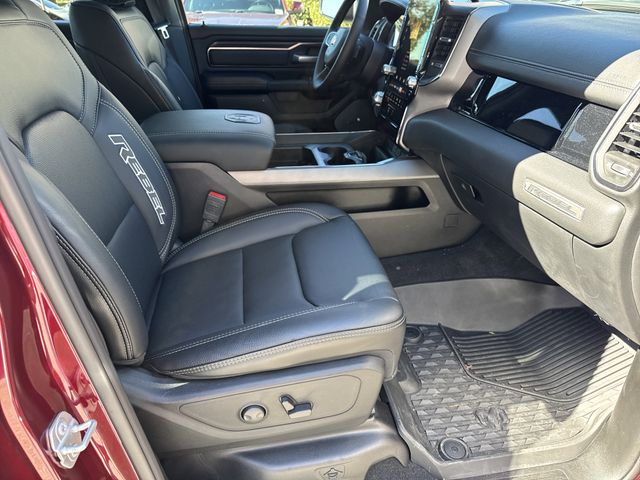Bluetooth, Backup Camera, 4 Wheel Drive, Navigation, APPLE CAR PLAY ANDROID AUTO, BLIND SPOT MONITOR, LCD DISPLAY SCREEN, POWER SUNROOF/MOONROOF, LEATHER INTERIOR, LOCAL TRADE IN, CLEAN CARFAX, SUPER CLEAN, PRICE REDUCED TO SELL BY MONTH END, 1500 Rebel, 4D Crew Cab, 10 Speakers, 115V Auxiliary Rear Power Outlet, 2-Door Passive Entry, Front Door Locks, 4 Way Front Headrests, 4-Wheel Disc Brakes, 4G LTE Wi-Fi Hot Spot, ABS brakes, Accent Color Door Handles, Accent Color Premium Power Mirrors, Accent Color Tailgate Handle, Air Conditioning, AM/FM radio: SiriusXM with 360L, Apple CarPlay, Apple CarPlay/Android Auto, Auto High-beam Headlights, Auto Power-Folding Mirrors, Auto-Dimming Exterior Driver Mirror, Auto-dimming Rear-View mirror, Automatic temperature control, Black Painted Exterior Mirrors Caps, Brake assist, Bucket Seats, Cloth/Vinyl Bucket Seats, Compass, Connected Travel & Traffic Services, Connectivity - US/Canada, Convex Wide-Angle Exterior Mirror Insert, Delay-off headlights, Dome Dual LED Reading Lamp, Driver door bin, Driver Seat Memory, Driver vanity mirror, Dual front impact airbags, Dual front side impact airbags, Dual Wireless Charging Pad, Dual-Pane Panoramic Sunroof, Electronic Stability Control, Exterior Mirrors Approach Lamps, Exterior Mirrors Courtesy Lamps, Exterior Mirrors w/Heating Element, Exterior Mirrors w/Memory, Exterior Mirrors w/Supplemental Signals, Front anti-roll bar, Front Bucket Seats, Front Center Armrest w/Storage, Front dual zone A/C, Front fog lights, Front Passenger Interactive Display, Front reading lights, Front Seat Back Map Pockets, Front wheel independent suspension, Full Length Upgraded Floor Console, Fully automatic headlights, Garage door transmitter, Google Android Auto, GPS Antenna Input, GPS Navigation, harman/kardon 19 Speaker Premium Sound, HD Radio, Heated door mirrors, Heated front seats, Heated Second Row Seats, Heated steering wheel, Illuminated entry, Integrated Voice Command w/Bluetooth, Leather steering wheel, Low tire pressure warning, Manual Folding Exterior Mirrors, Media Hub w/2 Charge Only USBs, Navigation System, Occupant sensing airbag, Off-Road Information Pages, Outside temperature display, Overhead airbag, Overhead console, Panic alarm, ParkView Rear Back-Up Camera, Passenger door bin, Passenger vanity mirror, Power Adjust 8-Way Driver Seat, Power Adjust 8-Way Front Passenger Seat, Power Adjustable Pedals w/Memory, Power door mirrors, Power driver seat, Power steering, Power Tailgate, Power windows, Proximity Approach/Departure Lamps, Quick Order Package 21W Rebel, Radio data system, Radio: Uconnect 5 Nav w/12.0" Display, Radio: Uconnect 5 Nav w/14.4" Display, Radio/Driver Seat/Mirrors/Pedals Memory, Rain Sensitive Windshield Wipers, Rear 60/40 Folding Seat, Rear anti-roll bar, Rear seat center armrest, Rear step bumper, Rear Window Defroster, Rebel Level 2 Equipment Group, Remote keyless entry, Security Alarm, SiriusXM w/360L, Smartphone As A Key Capable, Speed control, Split folding rear seat, Steering wheel mounted audio controls, Tachometer, Telescoping steering wheel, Tilt steering wheel, Traction control, Trip computer, USB Host Flip, Voltmeter.